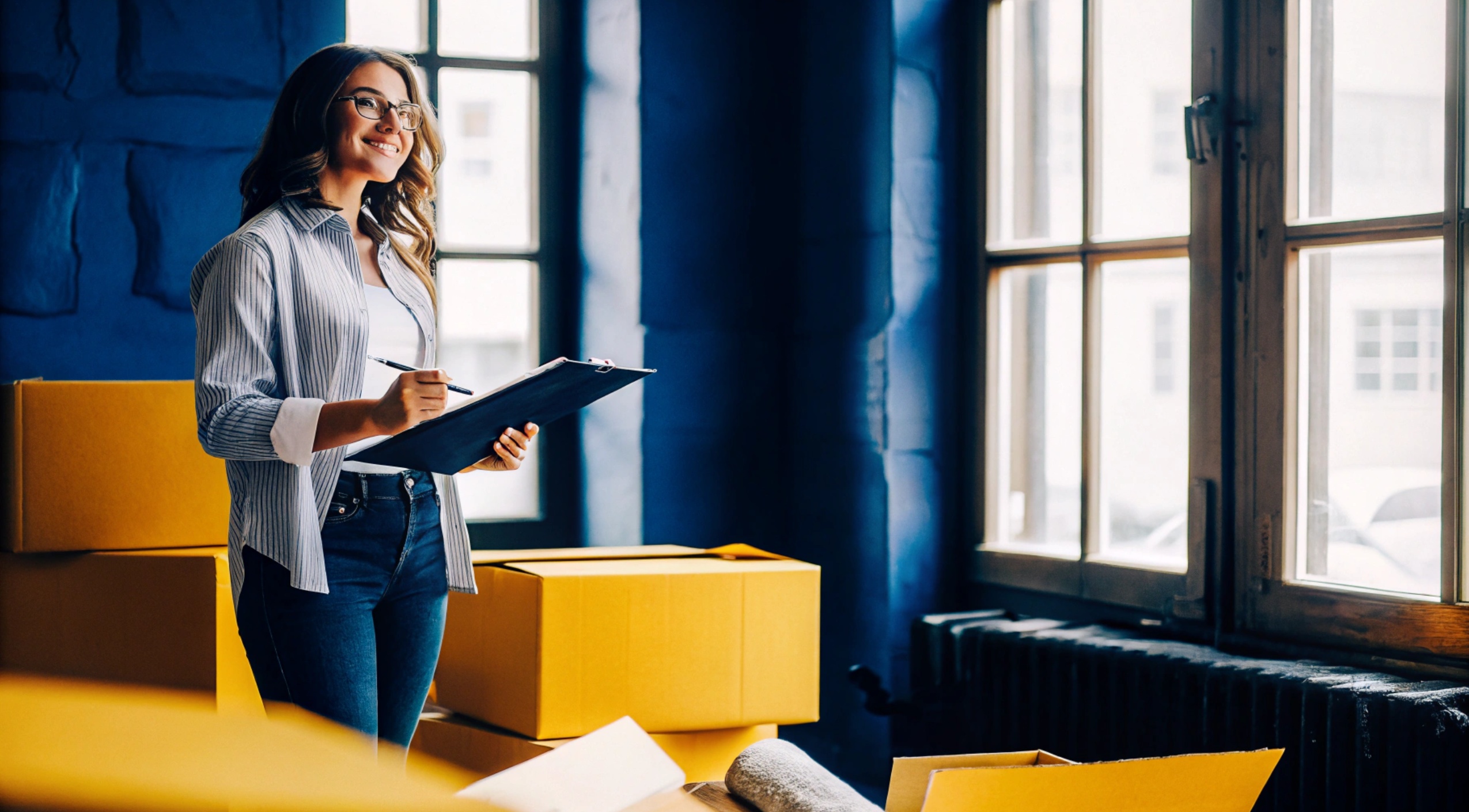 Επαγγελματίας γυναίκα κρατά μετακόμιση checklist της Prime σε νέο γραφείο, περιβάλλεται από κούτες και έγγραφα